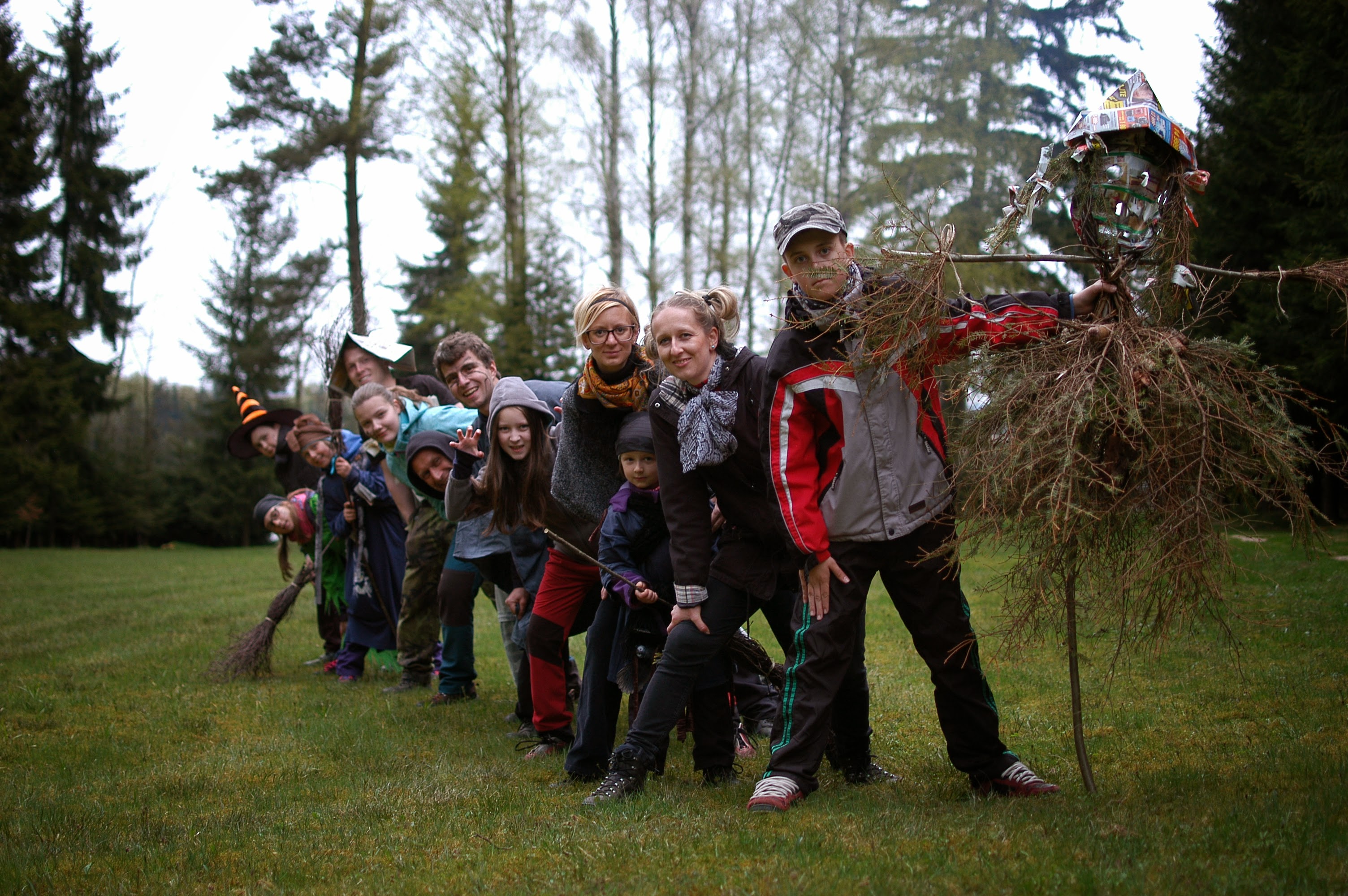 Chvílemi se zdálo, že bude pršet, ale díky naší pozitivní náladě jsme déšť rozehnali a v pohodě putovali dál kolem Starého dvora, přes pole a lesem až k chatě Smoldy. Tam bylo připraveno ohniště a čekal nás poslední týmový úkol, vyrobit čarodějnici. K dispozici jsme dostali provázek a noviny a ostatní jsme si museli sami najít v lese poblíž. Oba týmy byly velice šikovné, využily maximum přírodnin a v krátkém čase byli připraveni slavnostně nastoupit a donést čarodějnice k táborovému ohni. A jelikož jsme bezva parta, tak samozřejmostí byl i famózní slet čarodějnic k ohni. Těm jsme ještě dopřáli chvíli slávy, postavili je na čestná místa s výhledem na ohniště, a pustili jsme se do opékání buřtů a jiných specialit. Obzvláště Míra zabodoval svým obloženým grilovacím táckem.
