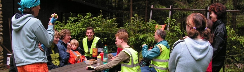 Bylo! Několikrát jsem si zachránil život úprkem do bažiny, několikrát skokem do kopřiv a několikrát pod hrází rybníka. Všude někdo, písknout, to byla sebevražda. Takže jsem se musel spíše schovávat než utíkat. Přišla vhod kadibudka, ale i studánka. Byl to báječný zážitek a když jsem rozdal poslední kartičky, tak mi přišlo líto, že už to končí. Kam se na to hrabe lov na lišku! A jelo se dál ... nohy měl každý odvážnější mokrý, pupínkatý od kopřiv a nevím co ještě, všichni byli pěkně utahaní a vyběhaní. A tak jsme si na kole odpočinuli. Dojeli jsme v poklidu do Matějova a dál k Rosíčce. Tady se připojili dva Horáci na jednom horákovi a začali jsme šlapat kopec k rozhledně. Pod úpatím byl sraz. Tam se povalovali krávy střežené ostnatým drátem nabytým elektřinou ... možná to byli býci. :) Do kopce se přihodila jakási nehoda technického rázu – možná spadnutý řetěz č tak něco ... každopádně Nikiska přijela na jednom kole s tátou. Ale pak už to bylo ok. Přesunuli jsme se k rozhledně, odložili kola a přesunuli se na rozhlednu, pohoupali jsem se na rozhledně, kdosi přesunul Katyšh dolu a pak se ostatní také přesunul zpátky na zem. A rázem byl oběd doplněný různými doplňky za tři kačky. I Zlesi si dvě pořídil, ale někdo ( a to od něj nebylo hezké) mu je schoval. Tady bych chtěl udělat malou vsuvku o Zlesim – našem zdravotníkovi. |