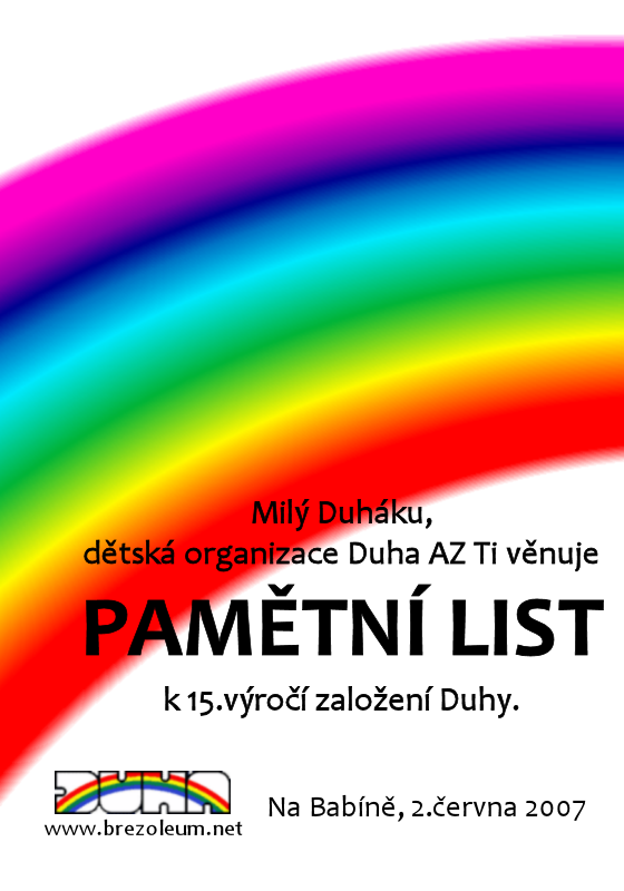 Dostala jsem zvláštní úkol od Zlesiho napsat jednu z kronik 15 výročí. Zvláštní proto, protože Vás osobně znám zatím opravdu jen málo a taky proto, že nemám s čím srovnávat, viděla jsem Vás všechny poprvé (tedy malá oprava Johnyho jsem viděla už několikrát v knihovně a Muflona ve Vaňkovce), takže nevím, jak se Duha za 15 let své existence vyvinula. A proto dál budu pokračovat vyprávění o krásně prožitém dni z pohledu nezávislé osoby.