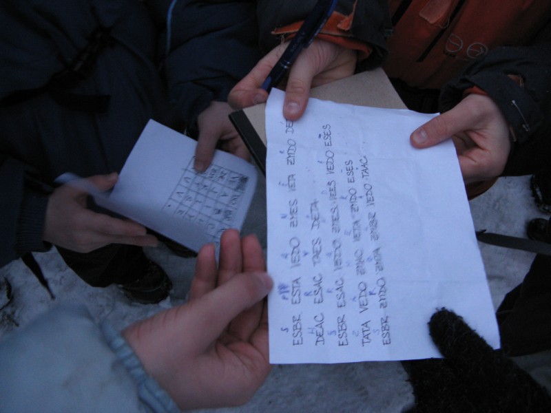 A pak už byla naše hra. Po lese byly rozmístěné lístečky s 2 symboly a písmenem, a skupinky je musely najít, zapsat do tabulky a zjistit,