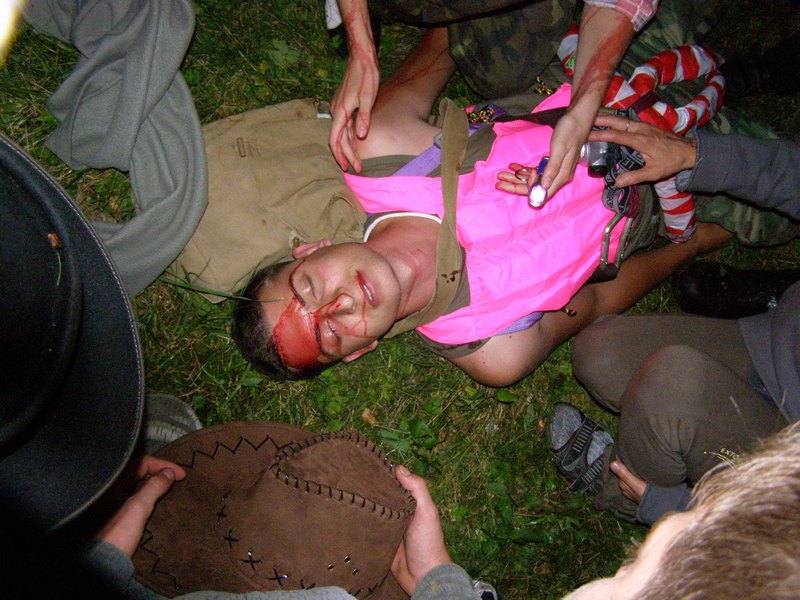 ho a ptají se ho, co tam dělá, ale on si na nic nepamatuje…skupinky